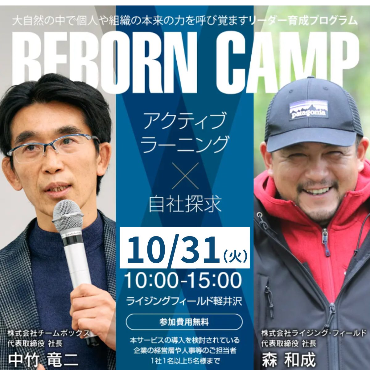 本日より、10/31(火)開催の大自然の中で組織本来の力を呼び覚ますリーダー育成プログラム「Reborn Camp 無料体験会」の予約を開始しました。